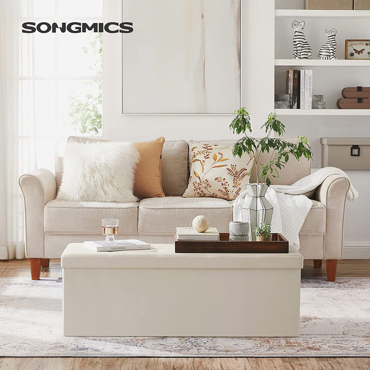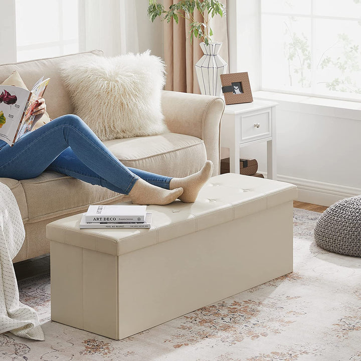 Puff, összecsukható tároló pad ottomán, teherbírás 300 kg, műbőr, bézs